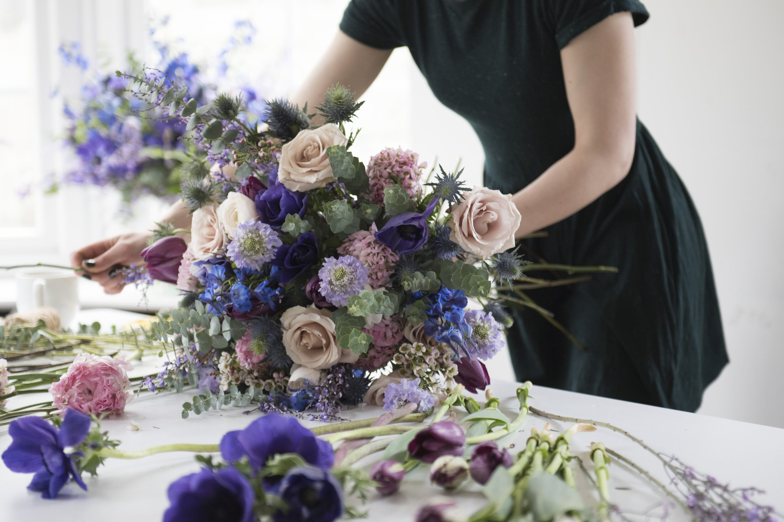 A warm and rich bouquet of orange lilies, marigolds, and autumn leaves.